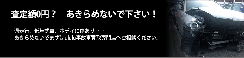ululu事故車買取専門店では、過走行車、過年式車、不動車や、車検切れのお車などだけではなく、 買取で困った、という車全般の買取を行っています。 大手ディーラーや他社下取り会社では買取を断られてしまったお車でもululu事故車買取専門店なら買取が可能! 他社査定額に不満のあるお客様、買取査定額0円と回答されたお客様、ぜひお問合せ下さい。